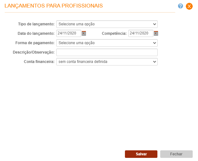 Em Tipo de lançamento, selecione a opção desejada, em seguida, selecione o profissional, preencha os outros campos, o valor, e clique em salvar.