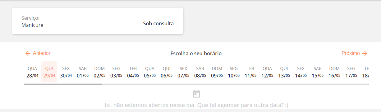 Já para o cliente, aparecerá a seguinte mensagem, não permitindo ele de realizar um agendamento:
