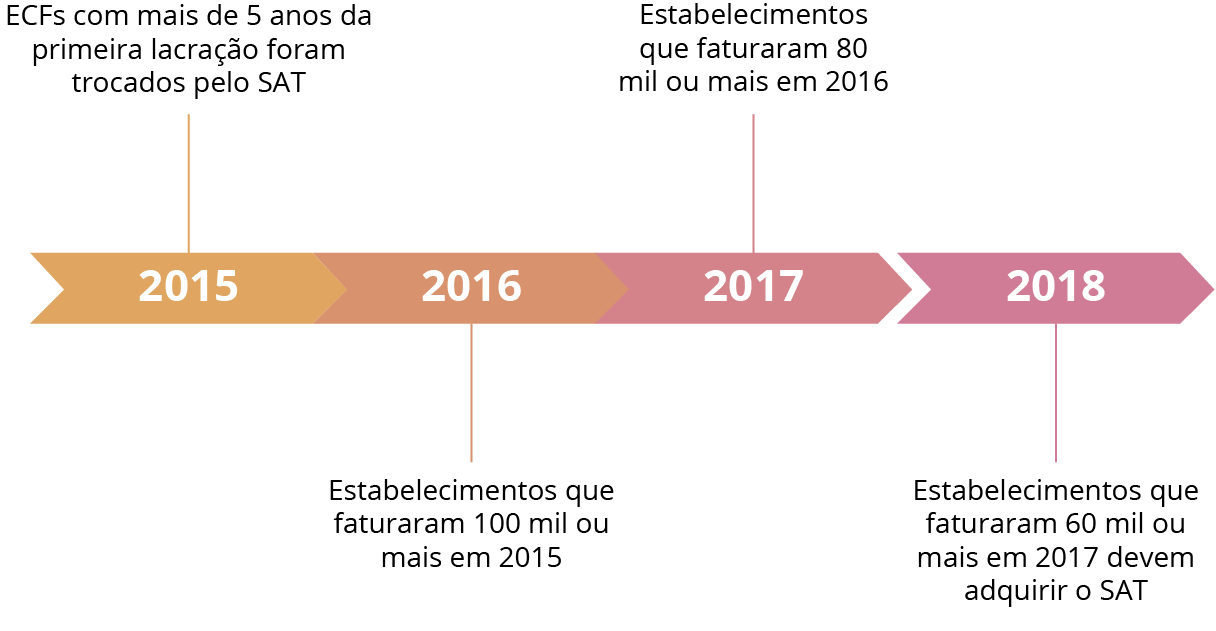 A implementação do SAT está ocorrendo em fases, e diversos negócios já aderiram seu uso conforme calendário previsto por lei. O projeto saiu do papel em julho de 2015 e tornou-se um equipamento fiscal eletrônico de uso obrigatório para o varejo.