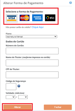 3. Selecione a forma de pagamento e insira as informações nos campos abaixo. Por último, clique em "Alterar" e pronto o cartão será alterado com sucesso.