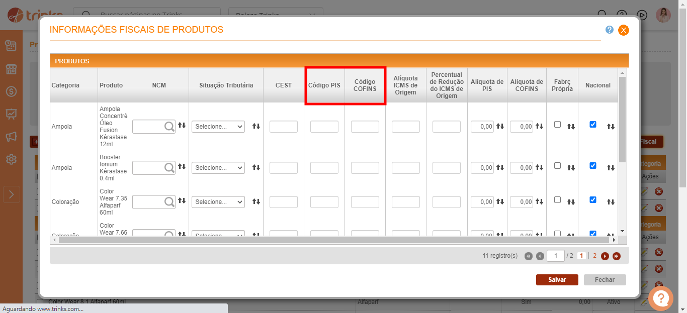Na tela Informações Fiscais de Produtos insira o Código PIS e Código COFINS.